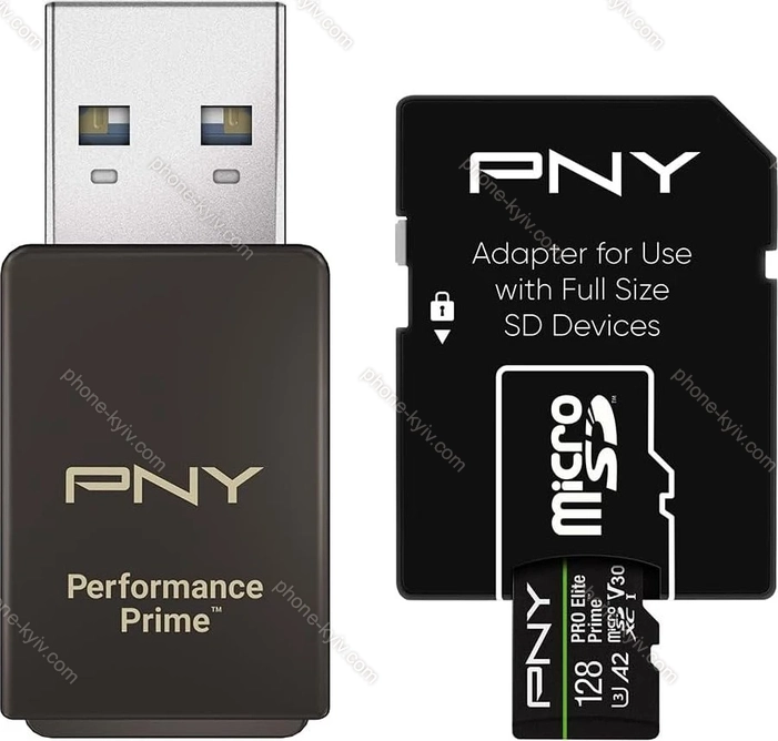 | Карта пам'яті PNY Pro Elite Prime R200/W150 microSDXC 128GB USB-Kit, UHS-I U3, A2, Class 10 купити Київ: гарна ціна, безкоштовна доставка, Україна | id001385 | 1 SD-карти